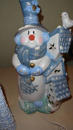 Beautiful hand made ceramic snowman and trees. Snowman has a light inside. With 3 hand made trees of different heights included. No nicks, cracks, or issues. Just a wonderful addition to your...